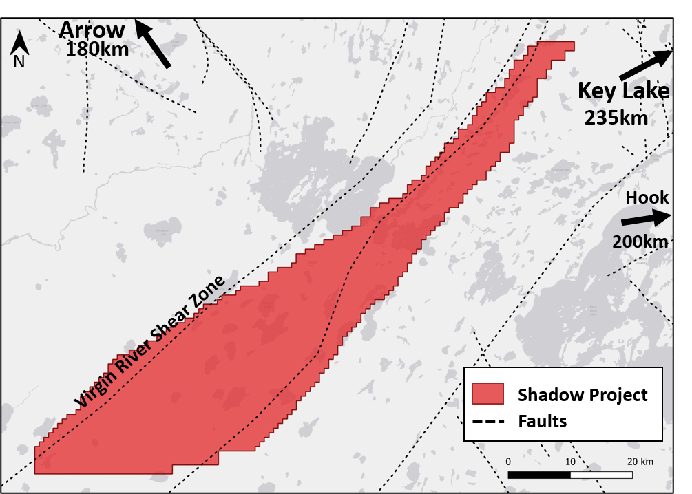 Four uranium deposits north of the Shadow property have previously been discovered along a 250-km strike extension of the VRSZ, proving the VRSZ is a fertile structural corridor for uranium mineralization. The Shadow property straddles the VRSZ over a 60 km-long strike length that has never been explored for any mineral commodity.