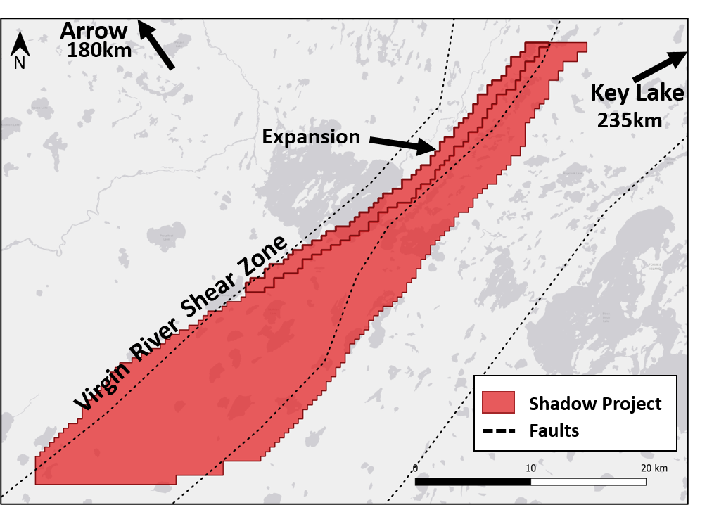Toronto, Ontario – August 28, 2020 – Baselode Energy Corp. (“Baselode” or the “Company“) (FIND:TSXV) is pleased to announce that it has expanded its land position at its Shadow uranium property (“Shadow”) in the Athabasca Basin area (“Athabasca”) of Saskatchewan, Canada.  Shadow now covers 46,000 hectares (460 km2) and encompasses a larger area along the Virgin River Shear Zone (“VRSZ”).