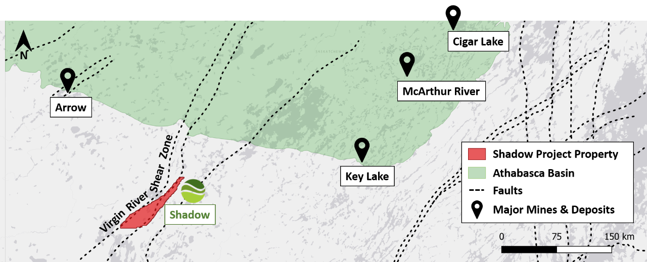 Baselode’s flagship Shadow Project spans 42,000 hectares and checks all the boxes for a possible Athabasca 2.0 deposit. The property lies outside of the Athabasca Basin and was staked along one of the largest and most prominent structural corridors in northern Saskatchewan—the Virgin River Shear Zone (VRSZ), which presently hosts at least 3 uranium occurrences. Cameco’s Centennial deposit, located in the basin, is also structurally controlled by the VRSZ and the deposit has a +700 metre sandstone cover; again, posing significant development challenges compared to our Athabasca 2.0 model. These deposits show that the structure is fertile for uranium.