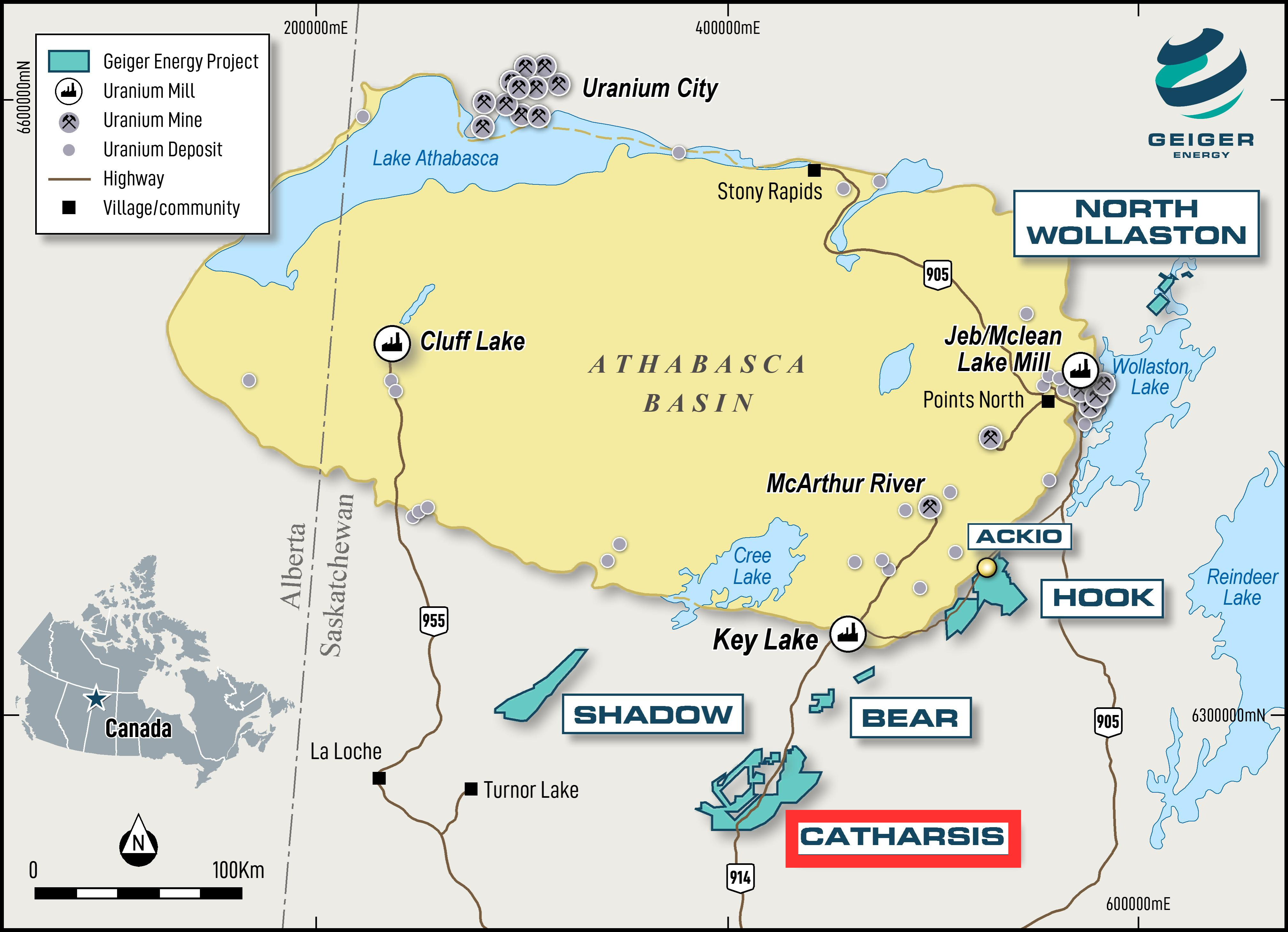 The Catharsis project is 100% owned by Geiger Energy with no underlying royalties. Catharsis is on geological strike with the World’s largest and most-productive high-grade uranium district, the Wollaston and Mudjatik domains. Over 2 billion lbs U3O8 have been discovered along this trend. When searching for uranium deposits, this trend is the high-grade capital of the world.