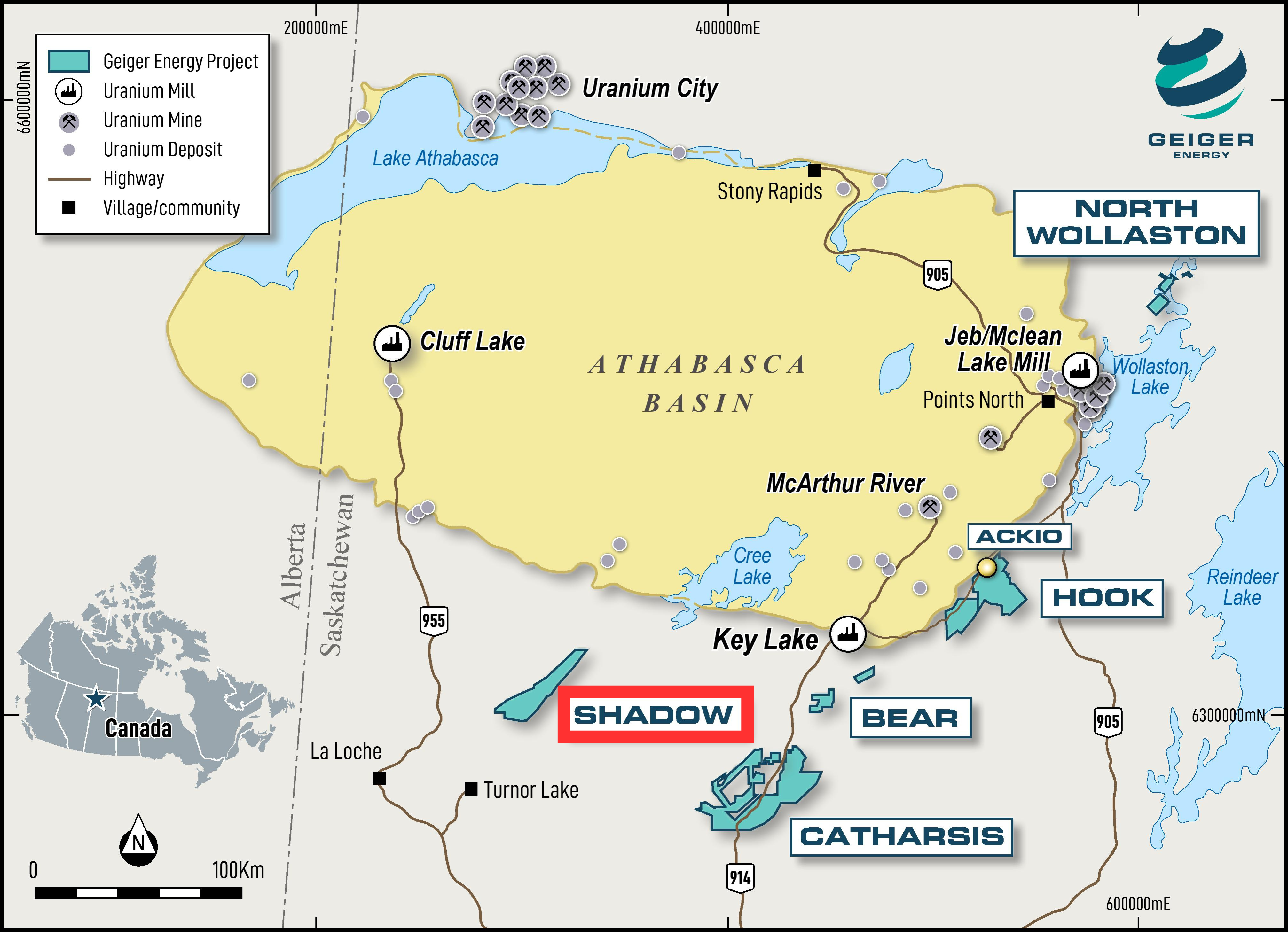 The Shadow Project is 100% owned by Geiger Energy with no underlying royalties. Shadow exhibits all similar structural and geophysical features recognized amongst the “Best-of-the-Best class” of Athabasca high-grade uranium deposits, such as the McArthur River and Arrow deposits.